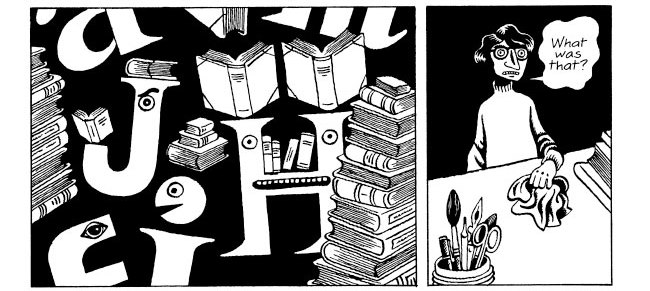At the risk of over-generalizing, comics are an exceptionally good delivery system for this sort of imagery. In film, the appearance of an object usually comes with assumptions about the object’s tangibility etc. In comics, what we see has more interpretive latitude—readers can understand the meaning of an image, as with the books staring back at David, divorced from assumptions about the objects’ existence in real space. Incidents makes use of this phenomenon pretty much constantly—signifiers coexist with objects of actual presumed volume and weight.