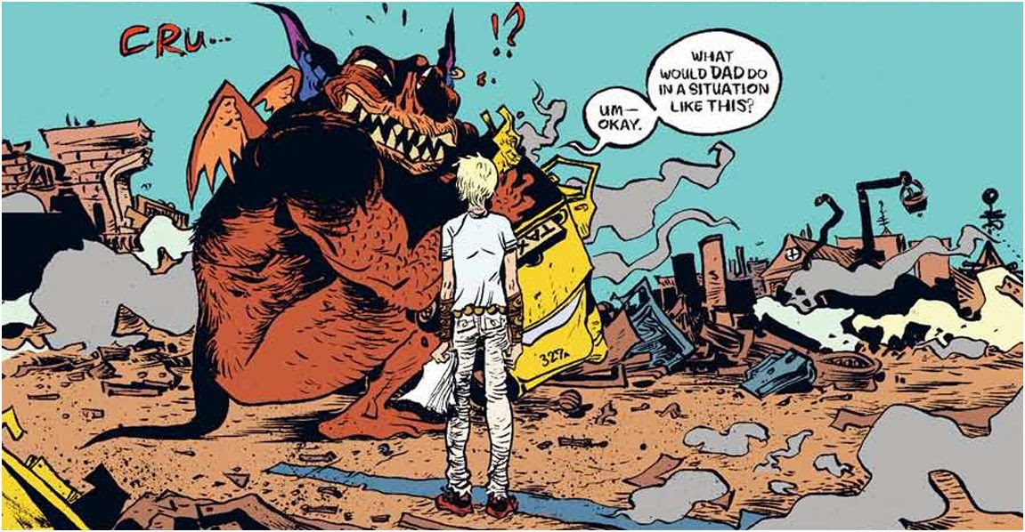 Battling Boy shouldn’t be written off as shallow exhibitionism. There’s too much charm and levity throughout the story for that charge to stick. (If Pope’s drawing to impress, he’s obviously drawing to have fun, too.) For instance, collection of animal T-shirts endows Battling Boy with the power of their respective animals; when picking a shirt before a battle, the boy must choose carefully. Details like this display a lightness of touch not always present in Pope’s earlier work, even if they don’t register as particularly personal. (In fact, the concept is weirdly reminiscent of ’90s cartoon toy shill Mighty Max and his magic baseball cap.)